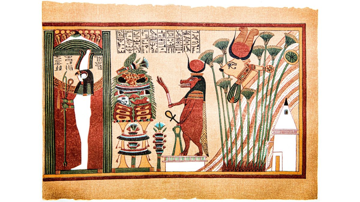 On the left, Osiris-Seker stands in a shrine in mummified form. The name Osiris-Seker represents the fusion of Seker, the god of death, with Osiris, the god of resurrection. The Papyrus of Ani ends with the tomb of Ani, the white building with the pyramidal top, located at the foot of the mountain of Amenta, at Thebes. Emerging from the mountain’s slope into a papyrus thicket is the head of Hathor in the form of the divine cow. This goddess, mistress of the necropolis, who welcomes the arrivals of the deceased to the underworld, is also associated with the protection of women. Standing before a lavish presentation of luxuriant offerings is another manifestation of Hathor, known as Tawaret. She has the head and body of a hippopotamus, the legs of a lioness and the tail of a crocodile.