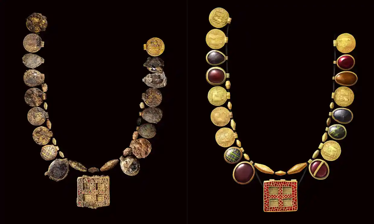 medieval female burial 3 December 23, 2022 1240 × 744 Early medieval female burial site is ‘most significant ever discovered’ in UK Necklace reconstruction and layout side by side.